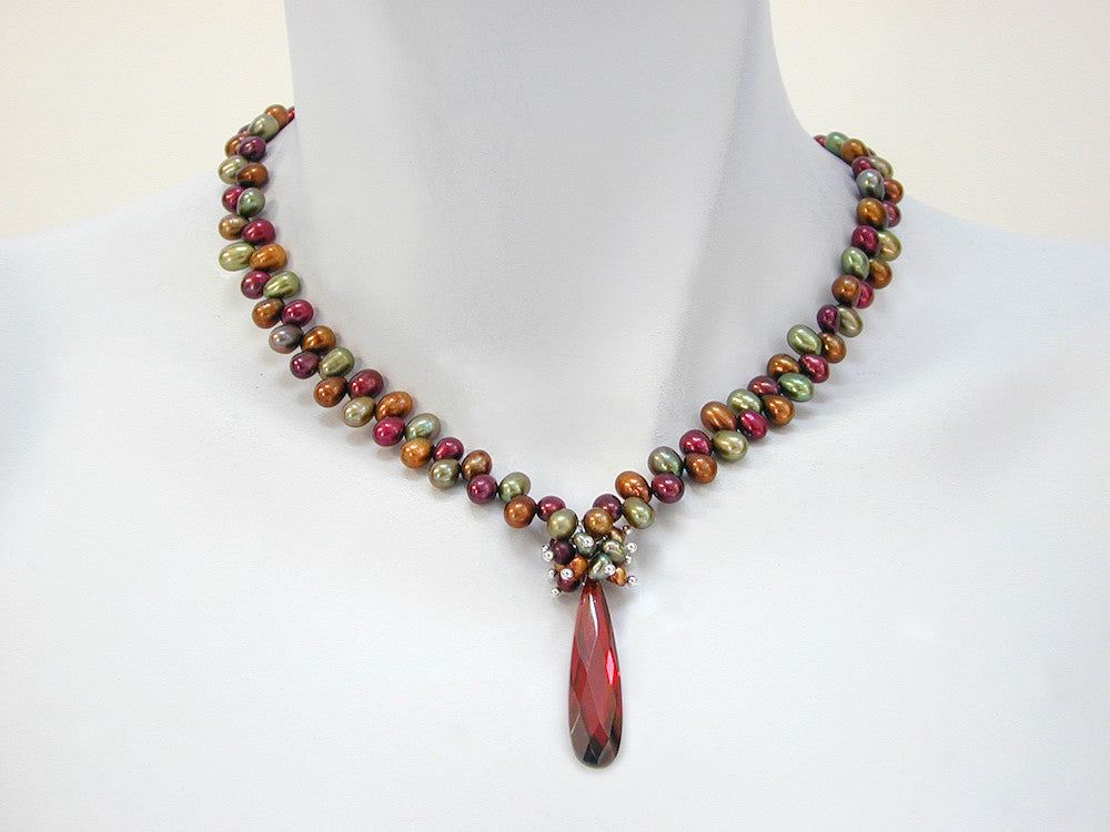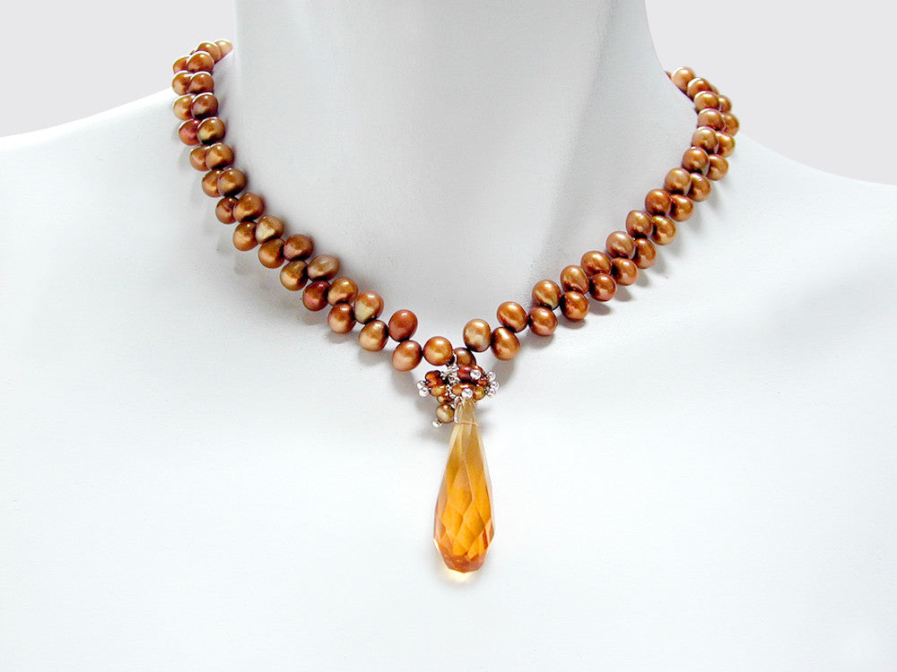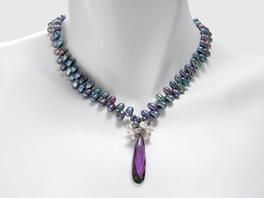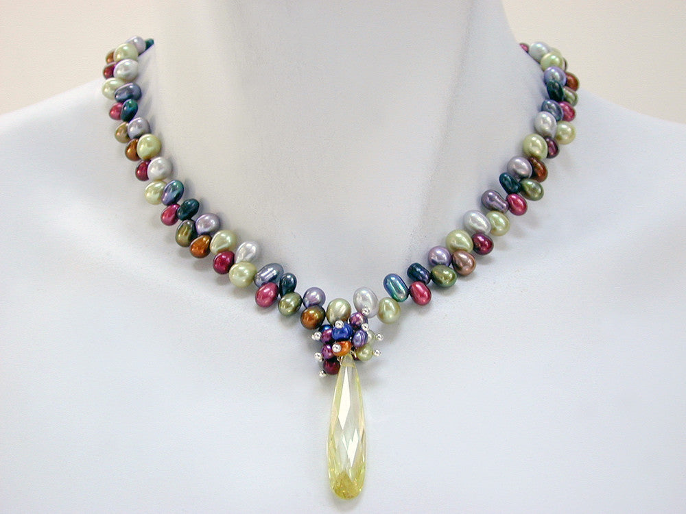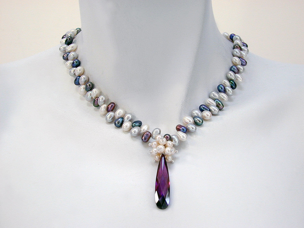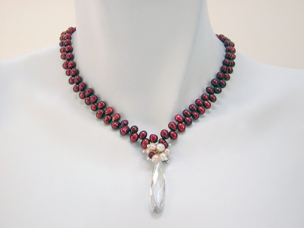 • freshwater pearl necklace with pearl cluster and faceted Austrian crystal drop