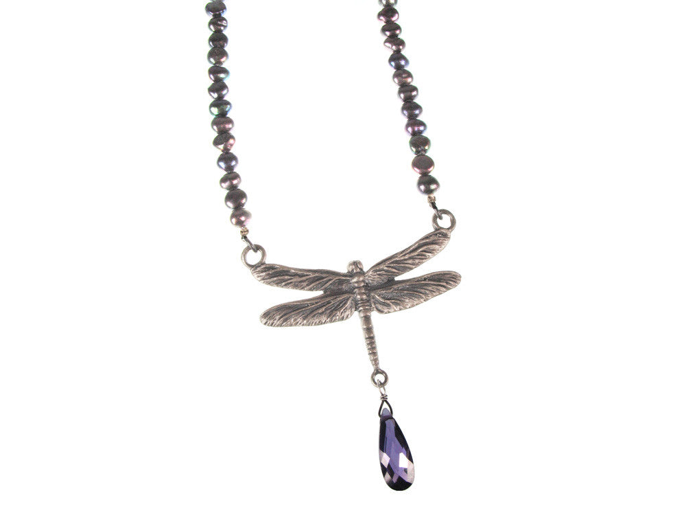 Peacock colored freshwater pearl necklace with a cast sterling dragonfly accented with a faceted purple Austrian crystal drop. Finished with a sterling extender chain & lobster claw clasp.